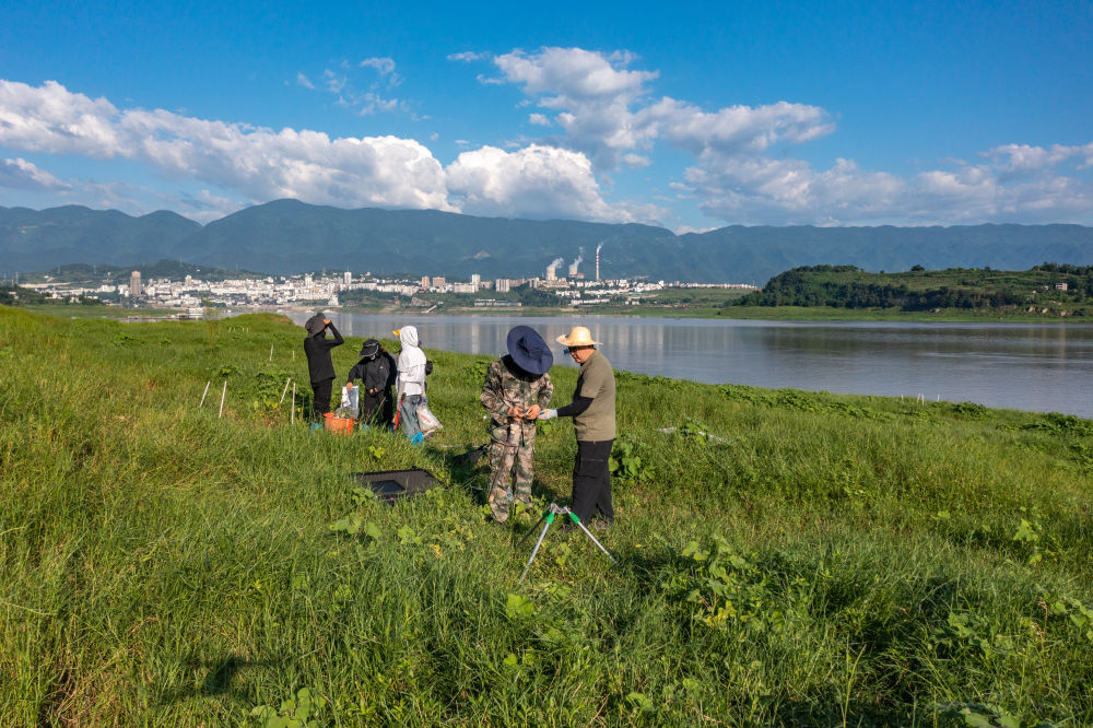 在位于重慶的中國科學院三峽庫區水土保持與環境研究站,中國科學院成都山地所科研人員在庫區消落帶上開展相關監測(2023年7月5日攝,無人機照片)。新華社記者 黃偉 攝