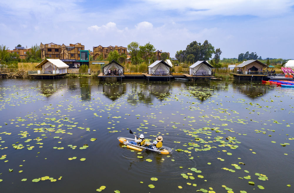 游人在滇池南岸晉寧區上蒜鎮小漁村劃船休閑(2023年4月30日攝,無人機照片)。新華社記者 陳欣波 攝